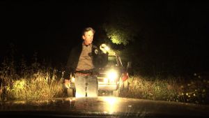 Aber sie ist halt anders und vor allem ganz anders in den Kasten gebracht worden. Abgesehen von einer kleinen Start- und einer ebenso kurzen Endsequenz bekommt der Zuschauer lediglich eine Kameraeinstellung zu Gesicht. Gleich zu Beginn wird dem Betrachter vermittelt, dass es zu einer Katastrophe gekommen sei und man Kameramaterial eines Polizeiwagens gesichert hat. 63 Minuten am Stück. Diese bekommt man an einer kleinen Einführung, welche die neue Kamera-Technik der Cops beschreibt, dargeboten. Eine fest installierte Kamera, die in ihrer starren Anbringung alle Bilder am Stück liefert. Die Idee funktioniert sehr gut. Über einen langen Zeitraum der 65 Minuten Laufzeit. Leute die aufgepasst haben, werden merken das da knapp 15 Minuten fehlen. Diese wurden für den Abspann reserviert. Aber das ist ein anderes Thema. Trotz der eingeengten Sicht, dem Fehlen von Schnitten und ohne ein ernsthaftes Mitwirken von Schauspielern wird in erster Linie eine bedrohliche Atmosphäre aufgebaut. Da der Film in seiner Optik eingeschränkt ist, muss er mit der Akustik einiges rausreißen. Und hier liegt einer der Stärken von „Invasion – Angriff der Körperfresser“. Die Geräusche wirken. Sei es abgehackter Funk, zotige Zombie-Geräusche oder auch nur die Stimmen aus der Umgebung. Es funktioniert. Im Film ist es die ganze Zeit düster. Die Filmsequenz spielt ja auch bei Nacht. Dennoch hat man sich Mühe gegeben, dass Ganze auch gut aussehen lassen. Ein Scheinwerfer, der auf dem Fahrzeug angebracht ist, sorgt für die Beleuchtung. Somit wird ein bedrohliches Bild mit einfachsten Mitteln erschaffen. Hauptspielplatz ist ein Park. Mit kleinen, engen Wegen.